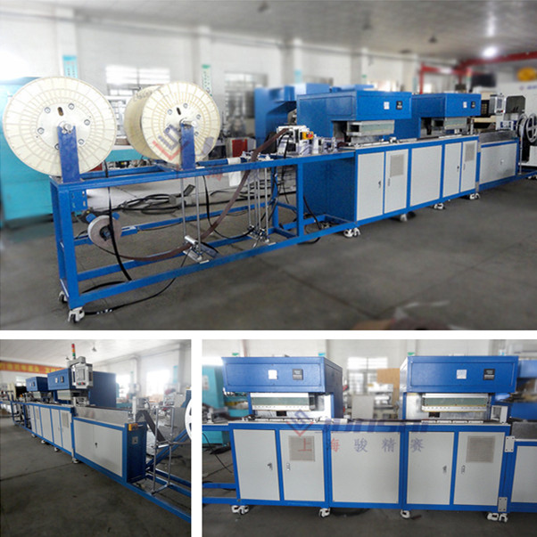 整條線為自動完成,熱合為高頻膠合,由于采用高頻電磁高頻振動,溫度由內部產生,所以熱合效果好,熱合力強,外觀平整。
