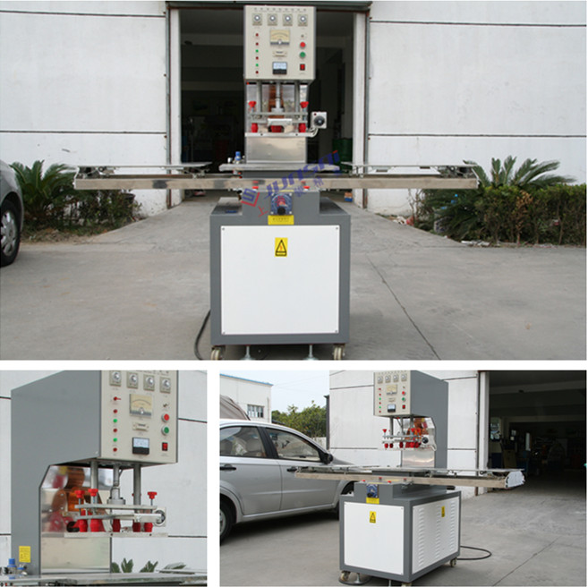 通過人工放料,高周波自動熱合壓邊切熔,定型,工作時通過人工放料,放入模具位置上,按起動開關,底部模具滑板自動滑動到固定工作位置,機頭氣缸驅動工模下降,通過延時預熱、高周熔接、切斷、定型,定型完畢機頭上升,底部工模滑板自動滑出,人工取出成品。在生產中可自由設置各部時間,一般為3--6秒一個作業過程。